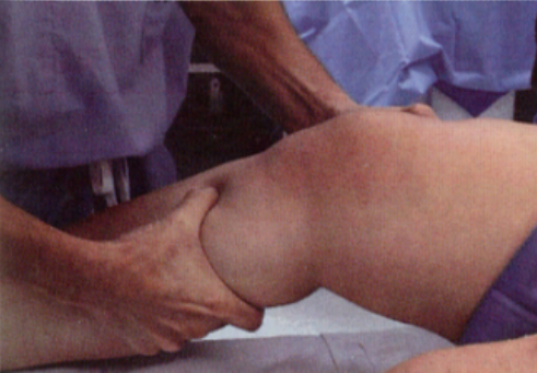 诊断 ACL 撕裂最敏感的检查,患者平卧,屈膝 15° ~ 20°,足置于床上。检查者一手抓住患者的股骨下端,一手抓住胫骨上端做方向相反的前后推动。